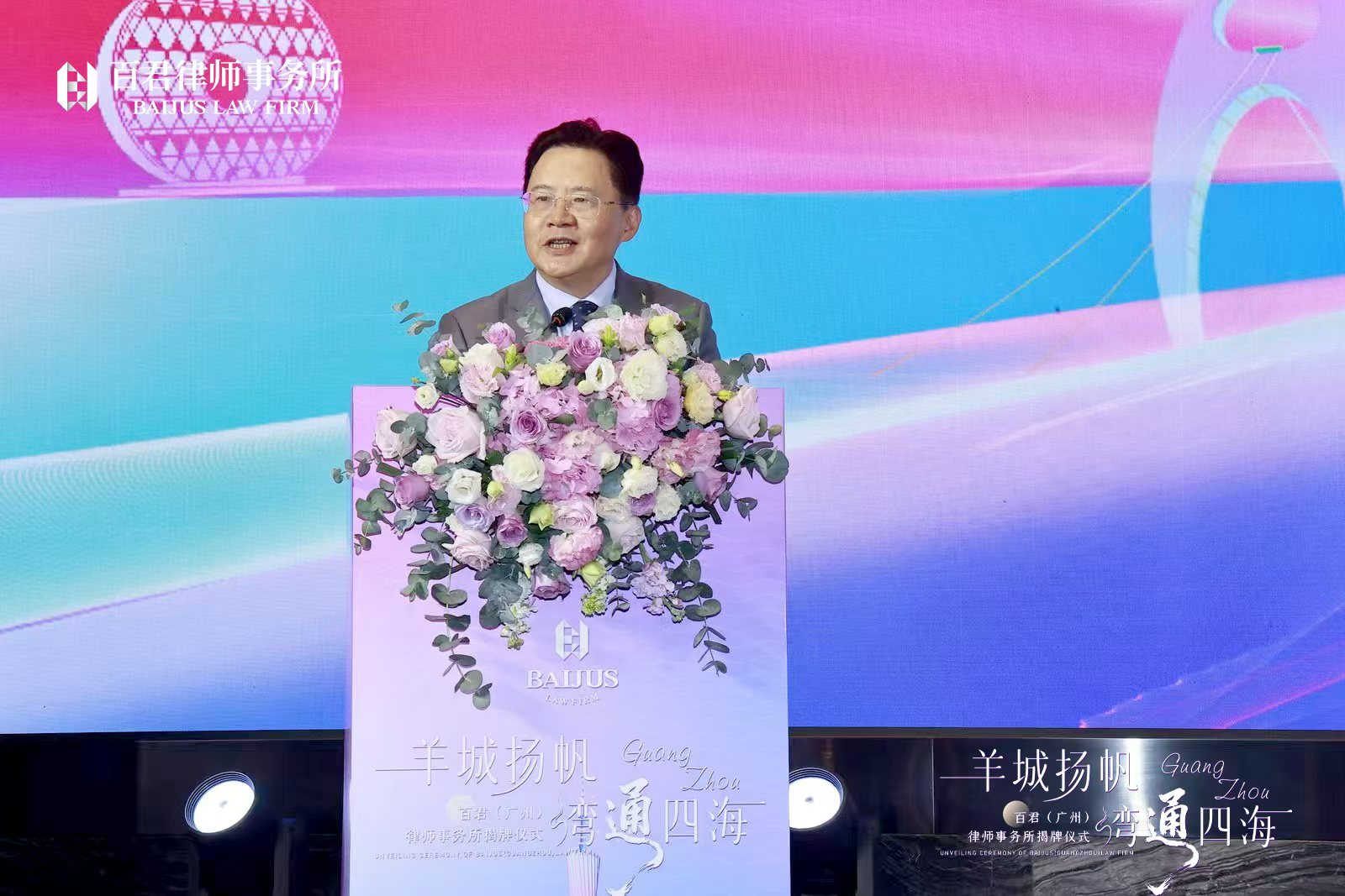 广东省西南政法大学校友会会长、广东省律师协会名誉会长、广州金鹏律师事务所创始人王波在致辞中衷心祝贺百君广州所开业。他表示,百君从西部走向全国,短时间内在北上广相继落子,展现出百君所的非凡魄力与战略眼光。广州是一个创业的好地方,期待百君人在怀抱远大理想的同时,秉持执着的精神,在大湾区无惧风雨,扬帆远航,创造出西部律师在大湾区的灿烂篇章。